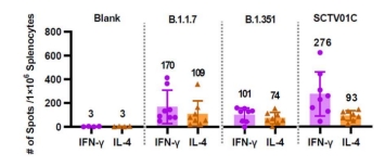 T米兰免疫反应,尤其是Th1优势米兰免疫反应,对于新冠病毒的保护效果、以及降低感染后重症和死亡率有十分重要的作用,而Th2偏向性免疫反应被认为是疫苗相关增强型呼吸道疾病(VAERD)的主要原因。经典的铝佐剂主要激活抗体免疫反应,T米兰反应整体较弱,而且更容易激活Th2偏向性米兰反应。SCTV01C采用了新型的水包油佐剂SCT-VA02B,可以诱导产生强效的Th1优势T米兰免疫反应(接种Alpha单价疫苗、 Beta单价疫苗及SCTV01C后,动物体内IFN+SFCs/IL-4+SFCs的比率分别为2.38,1.31,3.96,图3)。